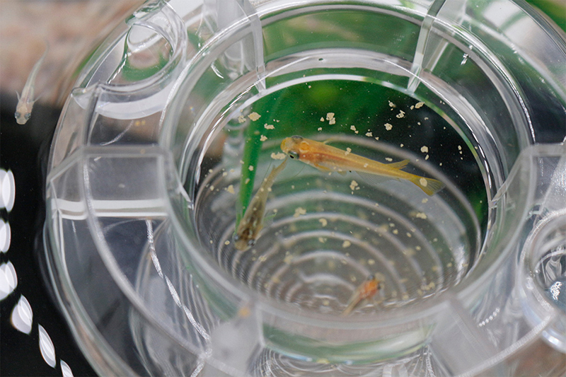 「初心者が飼育を失敗する多くのパターンが食べ残したエサの腐敗による水質悪化です。このツールを初めから使えば、エサの食べ残しを防止することが有効であるということが知識として身に付きますし、ここに集まって餌を食べる姿を見るのも楽しそうです。」松端秀明氏